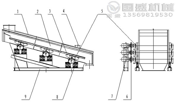 1.密封罩  2.篩箱  3.篩板  4.除塵口  5.激振器  6.軟連接裝置       7.電動機  8.減振彈簧  9.底托